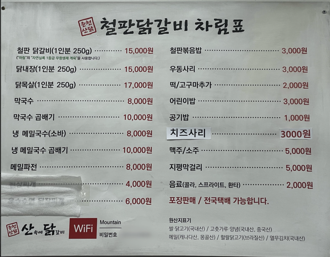 | 철판 양념닭갈비 | 15,000원 | 오리지널 춘천의 맛 |