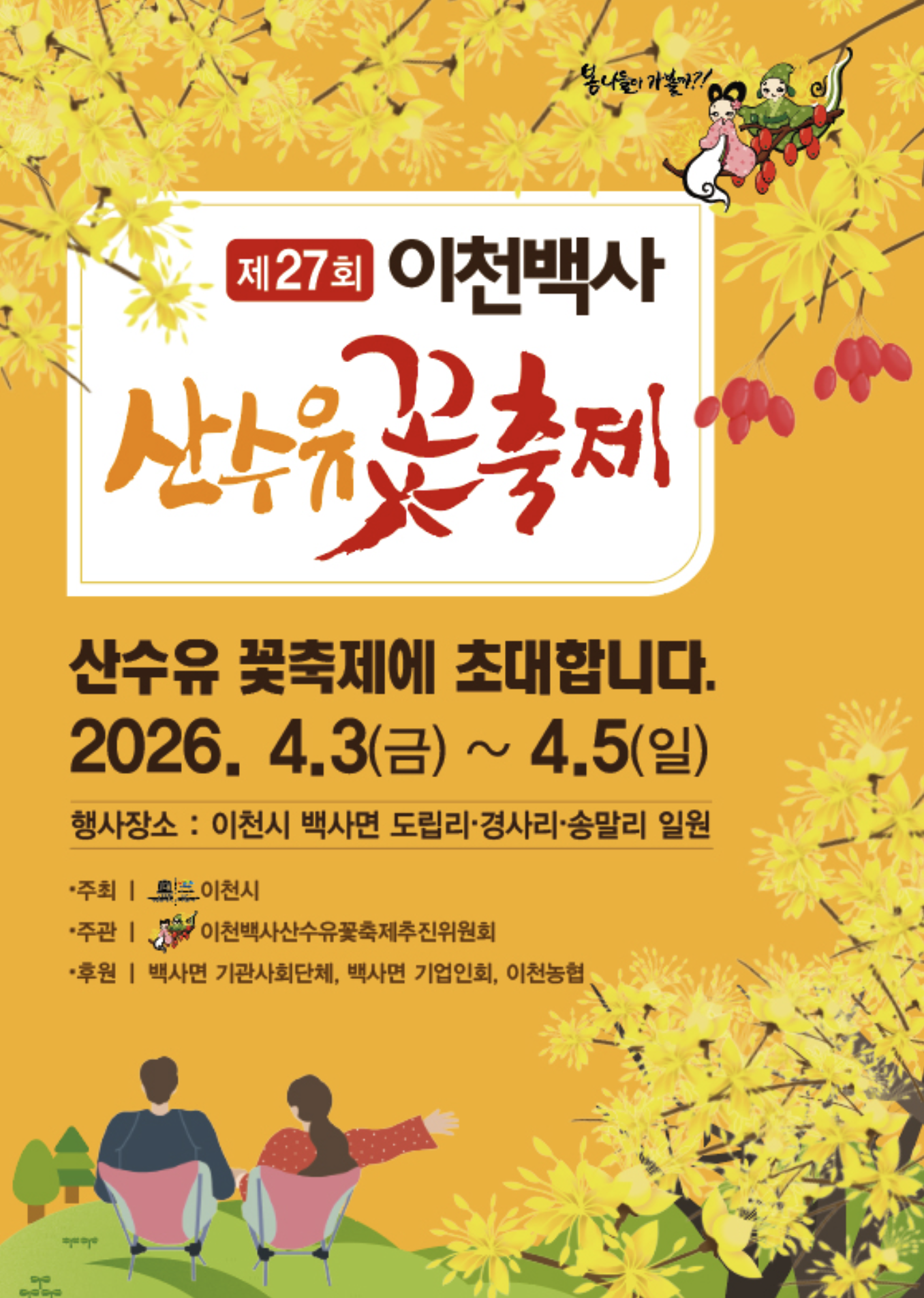 - 장소: 경기도 이천시 백사면 원적로775번길 12 (이천산수유마을 일원)