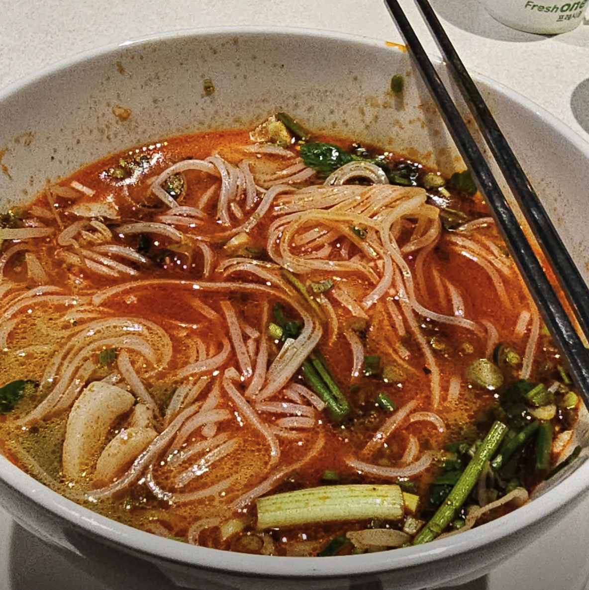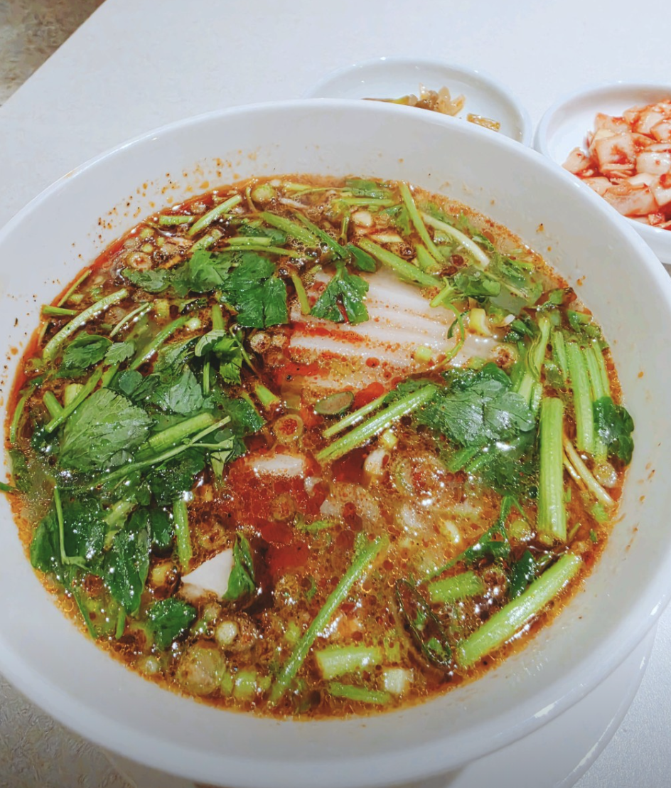 A: 고추기름이 들어가 붉은빛을 띠지만, 실제로는 구수하고 시원한 맛이 강해 맵찔이 분들도 충분히 맛있게 드실 수 있는 정도입니다.