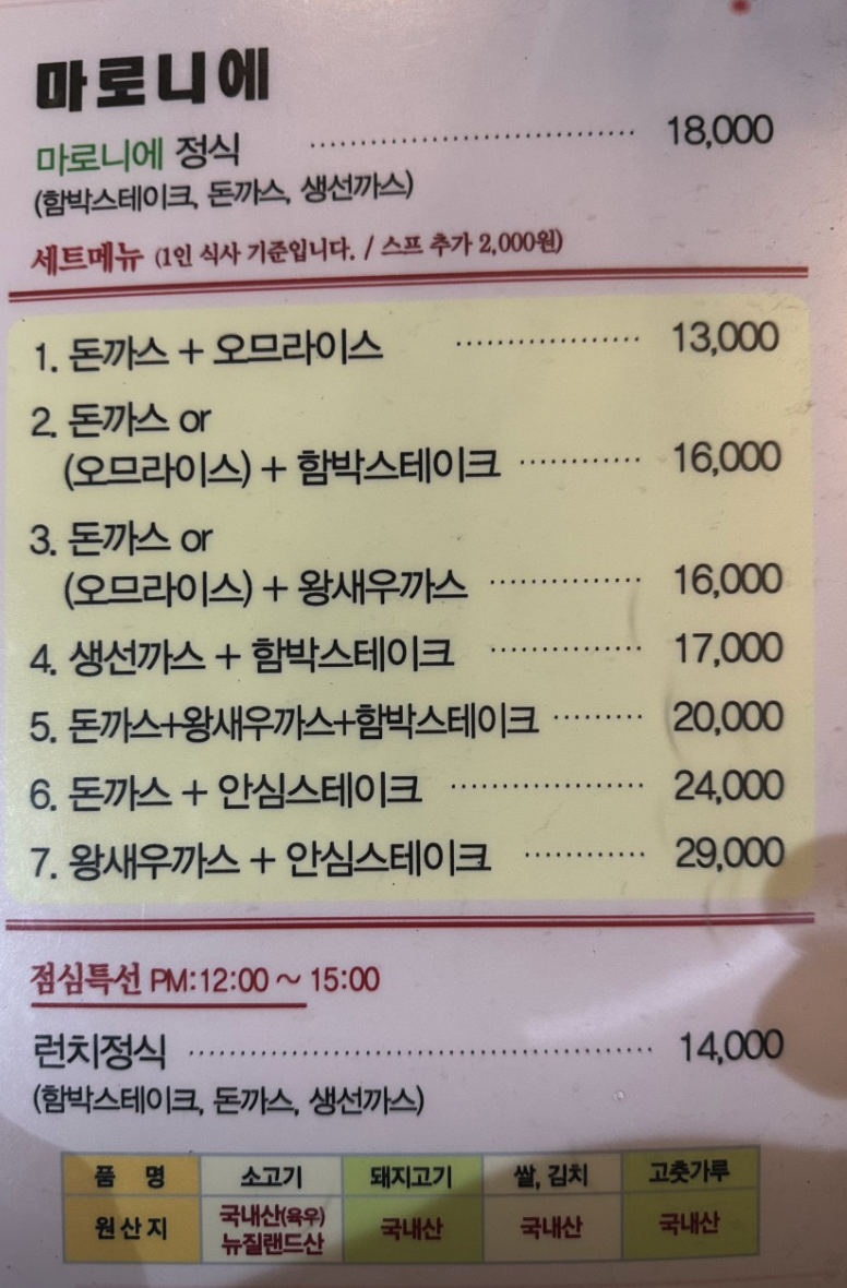 | 마로니에 돈까스 | 12,000원 | 사골 육수 소스의 정통 맛 |