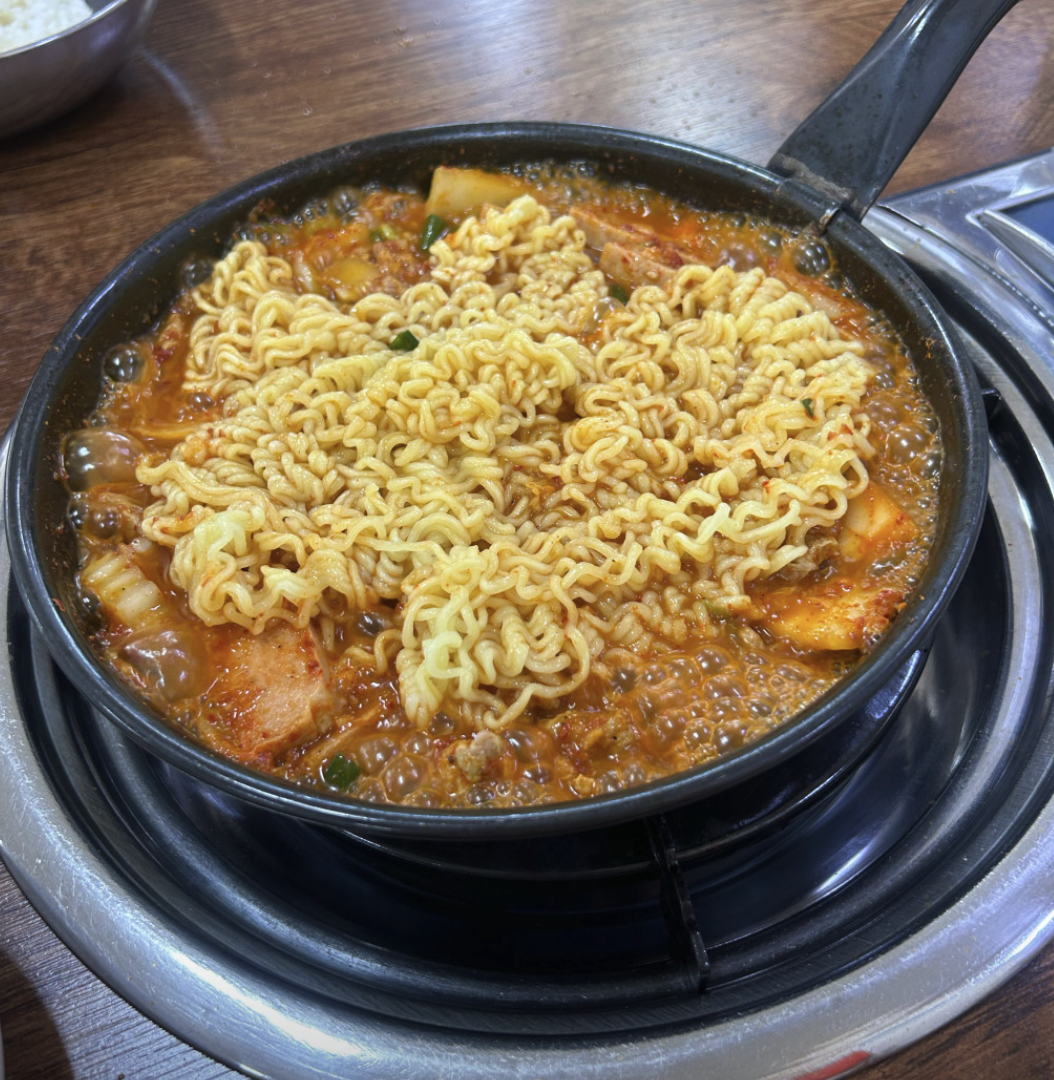 A: 찌개는 약간 매콤한 편(진라면 매운맛 정도)이지만, 셀프 계란후라이와 김이 제공되어 아이들도 밥과 함께 먹기 좋습니다. 유아의자도 구비되어 있습니다.