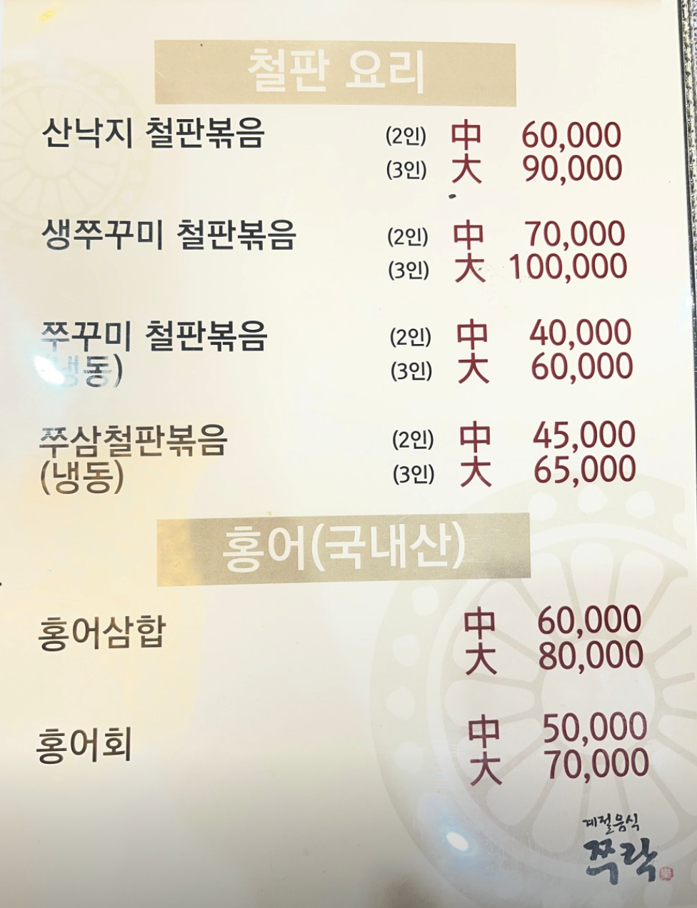 | 생쭈꾸미 철판볶음(중) | 70,000원 | 2인 기준, 먹물 볶음밥 추천 |