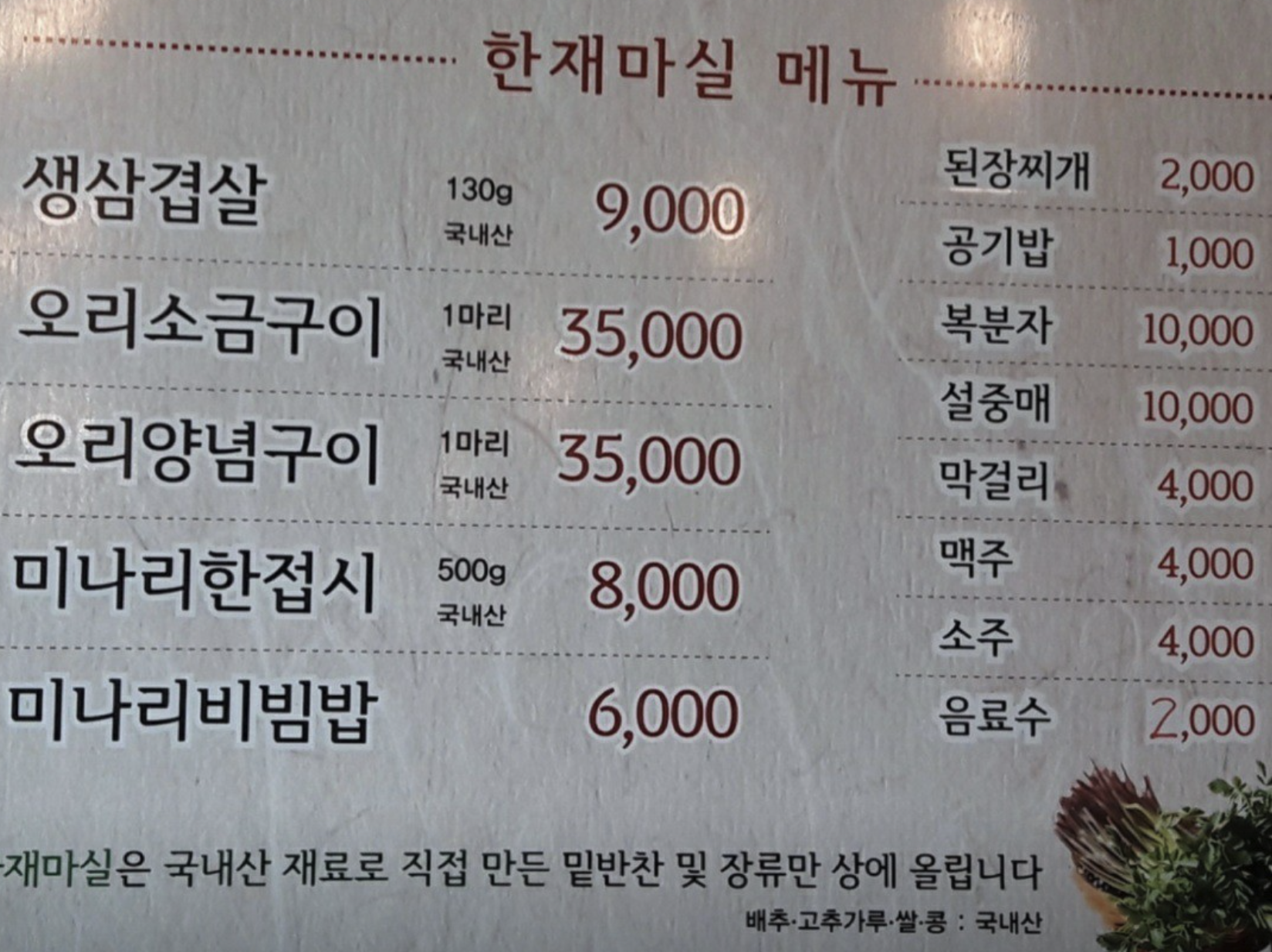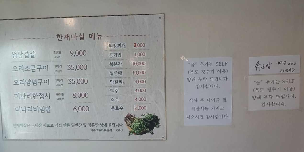 한재마실 메뉴와 가격은?