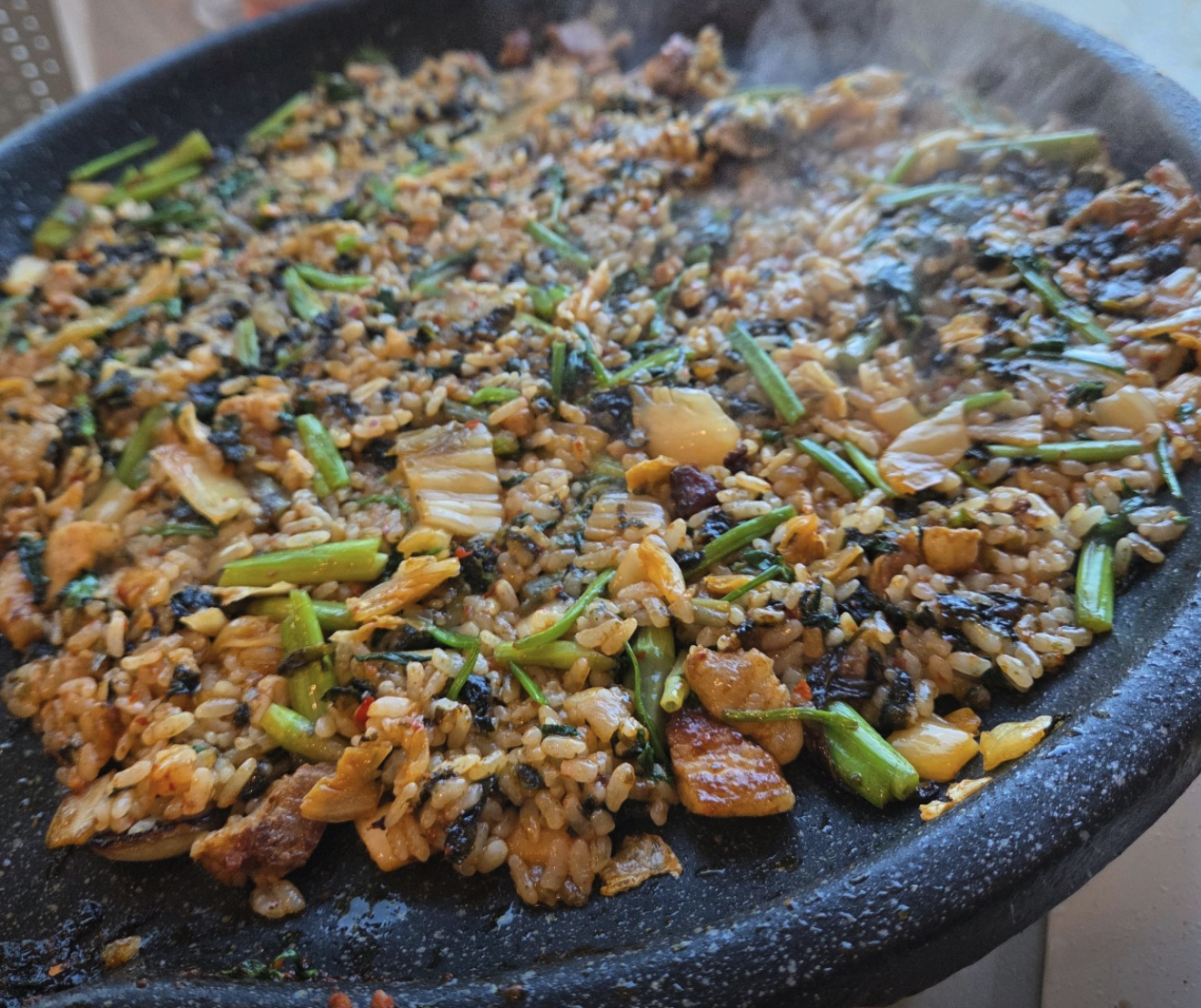 A. 한재마실의 미나리는 워낙 연해서 생으로 쌈을 싸 먹으면 향긋함이 폭발하고, 불판에 살짝 익히면 숨이 죽으면서 고기의 기름과 어우러져 고소함이 일품이에요. 두 가지 방법 모두 즐겨보시길 추천합니다!